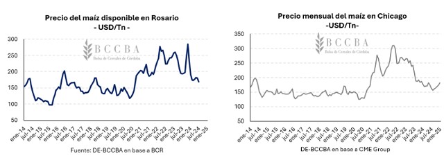 El precio del maíz disponible en Rosario para el mes de enero es de USD 190 por tonelada, por lo que no presentó variaciones interanualmente. Mientras que en Chicago, el cereal cotiza a USD 183 por tonelada, un 3% por encima del valor en enero de 2024.