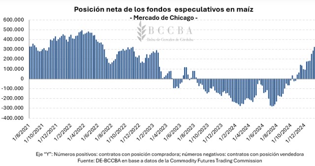 La posición neta de los fondos especulativos en Chicago del maíz continúa comprada. Respecto a la semana previa, la posición aumentó un 14%, situándose como la cifra más alta desde junio de 2022, a raíz de expectativas de subas en el precio del cereal como consecuencia del recorte en la producción esperada en Estados Unidos para la campaña 2024/25 y la consecuente caída en la producción mundial.