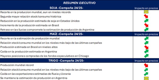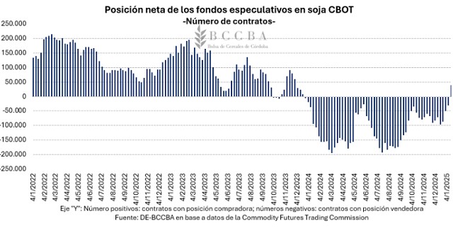 La posición neta de los fondos especulativos de Chicago en la última semana se ha revertido, encontrándose comprada, situación que no se presentaba desde diciembre de 2023. Un factor alcista que podría estar favoreciendo al precio de la soja es el nuevo régimen de promoción de biocombustibles llamado 45Z, en donde el aceite de cocina usado importado dejaría de recibir incentivos fiscales, pudiendo ser reemplazado por un mayor consumo de aceite de soja, lo que haría incrementar el precio de todo el complejo sojero. Este escenario podría verse influido, además, por el recorte de la producción de Estados Unidos por parte del USDA, y las condiciones climáticas que se están desarrollando en Argentina.