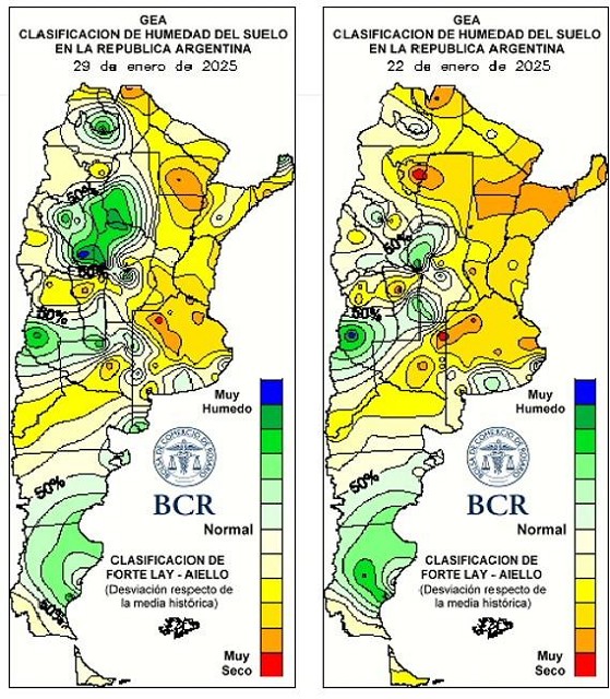 En Tortugas y los alrededores de Rosario, la falta de lluvias en los próximos días podría tener consecuencias irreversibles. En Pergamino, el cultivo aún mantiene su capacidad de compensación, pero no hay agua en el suelo para el llenado de granos. “Algunas localidades acumularon solo 20 mm entre diciembre y enero, volviendo imposible la recuperación sin lluvias inmediatas”, advierten. En Junín, se estiman rindes de entre 32 y 38 qq/ha, pero hay muchos cuadros que han perdido demasiados nudos debido al estrés hídrico. En Teodelina, es imprescindible que llueva la próxima semana para sostener 35 a 40 qq/ha. En Carlos Pellegrini, la soja retomó su desarrollo, pero necesita 40 mm en los próximos 10 días. Las lluvias trajeron un fuerte alivio en Bigand. En Bombal, la soja presenta un muy buen estado, sin hojas amarillas ni signos de deterioro. “Pero la continuidad de las lluvias será clave”, coinciden en señalar los técnicos.