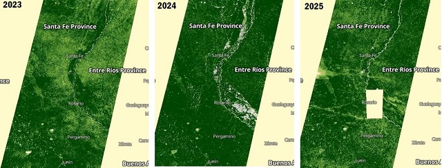 El NDVI identifica las áreas que han experimentado un crecimiento vegetal más vigoroso o más débil, por lo que detecta el impacto de condiciones climáticas adversas, como sequías, entre otros factores. En la comparación puede notarse cómo la falta de agua en el 2023 era más extensa, alcanzando sobre todo al oeste del norte de Bs As y a buena parte del centro sur de Santa Fe, mientras que en 2025 se ve que la zona más afectada abarca al norte bonaerense, pero se ve un nivel de daño comparable al del 2023. Para 2024 se debe tener en cuenta que en la segunda quincena de enero faltaron las lluvias; igualmente el contraste de condiciones es evidente.
