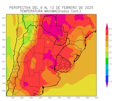 • La mayor parte del área agrícola observará temperaturas máximas superiores a 35°C con focos por encima de 40°C, que se ubicarán sobre gran parte del Paraguay, el norte de Formosa, el centro de Santa Fe y partes de Entre Ríos.