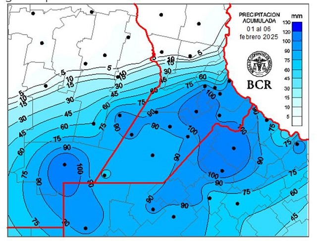 12 de las 36 estaciones ubicadas en el norte de la región, sobre todo el NO, recibieron menos de 10 mm o incluso no tuvieron registros. Pero en el resto, los acumulados del evento dejaron entre 60 y 120 mm. Hace una semana, técnicos de Pergamino advertían: “La sequía es total, y esperamos una pérdida de cosecha similar a la de la campaña 2022/23. Si lloviera ahora, todavía se podrían rescatar rendimientos aceptables”. Finalmente, cayeron 116 mm y el NE bonaerense, el epicentro de la sequía, recibió acumulados que van de 90 a 120 mm. Elorriaga explica: “un centro de alta presión, ubicado al sur de la costa de Buenos Aires, potenció el ingreso de humedad sobre el norte bonaerense y la franja sur de la zona núcleo”. De todos modos, llegan advertencias desde la zona de Marcos Juárez: “hay pérdidas de rinde irreversibles en soja en la mayoría de los lotes. En soja de primera, la merma estimada es del 25 % y un 10 % podría rendir menos de 20 qq/ha si no llegan lluvias pronto”.
