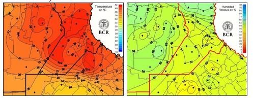 El lunes 3 de febrero la región medía en la mitad de las estaciones metereológicas de la red GEA/BCR máximas de 40 a 41°C y una humedad relativa en torno al 50%.