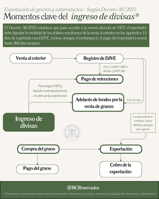 Dato clave: la baja temporal de retenciones establecida por el Decreto 38/2025 establece que el exportador debe liquidar los dólares de la venta al exterior en los siguientes 15 días de registrada una declaración jurada de venta al exterior, incluso aunque el embarque pueda realizarse hasta 360 días después, obligando de este modo a un esfuerzo financiero del exportador, que no tiene contrapartida en el corto plazo con una cobranza de exportación.