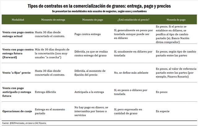 Además, el pago no siempre ocurre en el mismo momento que se realiza la operación de venta, existen distintas formas de comercialización de granos, cada una con su propio esquema de entrega y de pago.