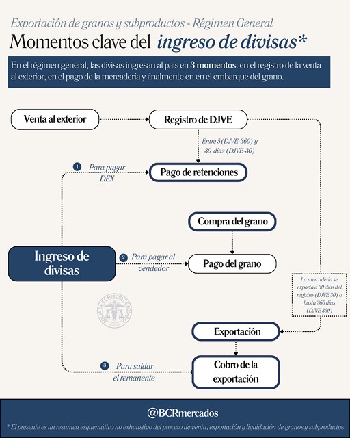 El proceso de liquidación de dólares resultante de la exportación de granos y subproductos no es a libre elección de las partes, sino que se realiza siguiendo toda la normativa legal que establece el Gobierno Nacional. Ahora bien, dentro de este marco, en la práctica el cambio de dólares por pesos en el mercado de cambio está vinculado a las necesidades del exportador de dinero líquido para hacer frente a pagos en moneda local que al despacho físico de los granos al exterior en sí.