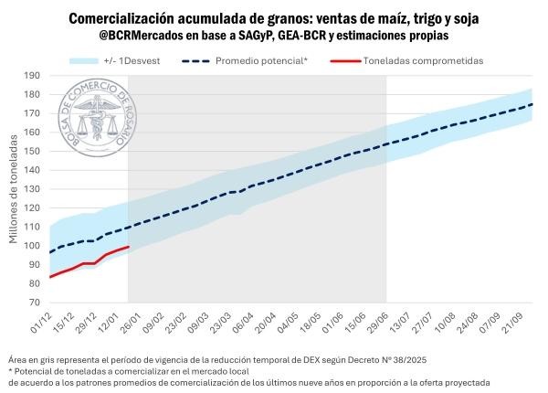 Si el efecto resulta ser aún más optimista, y la dinámica comercial de este año se asemeja a los patrones más elevados de la última década, el volumen de toneladas comprometidas podría llegar a superar las 64 Mt. Si, en caso contrario, el efecto no es el esperado, y la dinámica comercial tiende a parecerse a la de años con mayor reserva comercial, entonces el rango de compromisos podría estar rondando las 44 Mt de granos hasta el 30 de junio, siempre que la producción deje de caer y alcance las proyecciones al 15 de enero.