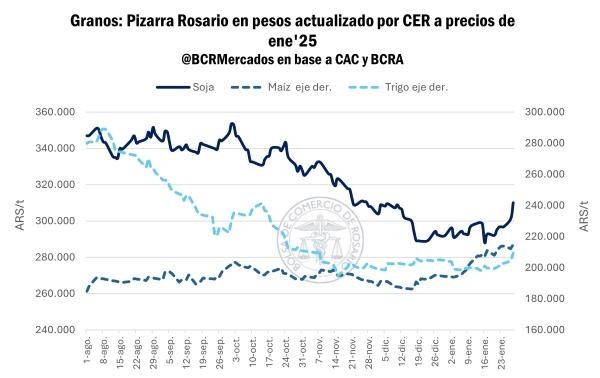 En la primera reacción del mercado durante la semana, la pizarra por soja llegó hasta los $ 310.000/t, el valor más alto desde fines de noviembre teniendo en cuenta el efecto de la inflación. Por maíz, se llegó a pagar en torno a los $ 215.000/t convalidando el gran momento por la cotización del cereal, que llega a máximos de junio del año pasado, en términos reales. En trigo, la abultada oferta limitó el efecto de la reducción de DEX, pagándose $ 6.000/t más que durante la semana pasada, tocando de todos modos los valores más altos desde noviembre.