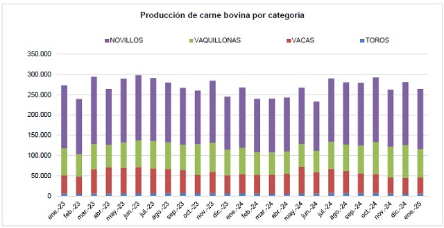 La producción de carne bovina del mes de enero de 2025 alcanzó las 263,9 mil toneladas res con hueso, recortándose en 18,9 mil toneladas con respecto al mes anterior, y también recortándose en 3,9 mil toneladas con respecto al mes de enero del año 2024.