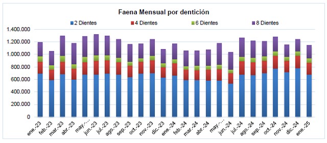 La faena del primer mes del año 2025 se ubicó en aproximadamente 1,142 millones de cabezas de ganado bovino procesadas. Esto implica una caída mensual, con respecto a diciembre del año 2024, del (-8,1%), que equivale a unos 101,2 mil animales; y una caída de un (-2,0%) con respecto al mes de enero de 2024, que equivale a cerca de 22,8 mil cabezas. Ajustado por la cantidad de días hábiles del mes, que fueron 22, se produjo una caída con respecto a los 20 días hábiles de diciembre, que resultó del (-16,5%), y la faena diaria alcanzó en enero de 2025 las 51,9 mil cabezas, quedando por debajo de las 62,2 mil diarias, promedio, de diciembre último.