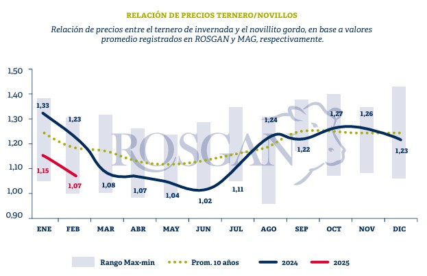 Esta misma relación, que hoy -en lo que va del mes- se ubica muy cercana a 1, históricamente, para esta época del año, cuando la oferta de terneros aún es escasa, oscila entre 1,15 y 1,20 kilos de ternero por kilo de novillito terminado.