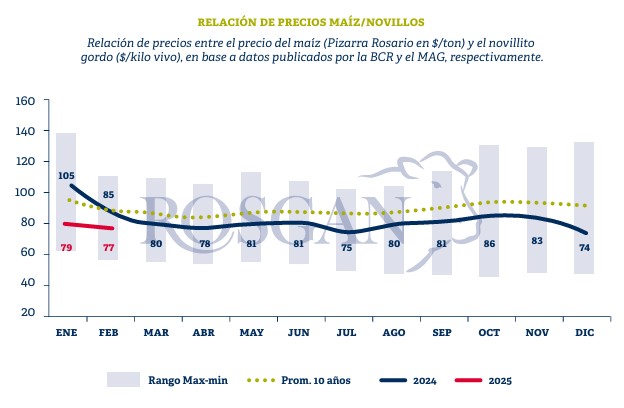 Sin embargo, tras la reciente suba del gordo, el valor del producto terminado acumula en igual período una variación del 16% en términos corrientes, pasan do de promedios de $2.500 el kilo en diciembre a los $2.900 actuales. En definitiva, la relación insu mo-producto arroja actualmente unos 77 kilos de gordo por tonelada de maíz relación que, si bien es ligeramente más cara que lo que valía a fines del año pasado, es un 10% más barata que un año atrás y un 12% inferior al promedio resultante para esta misma época en los últimos 10 años.