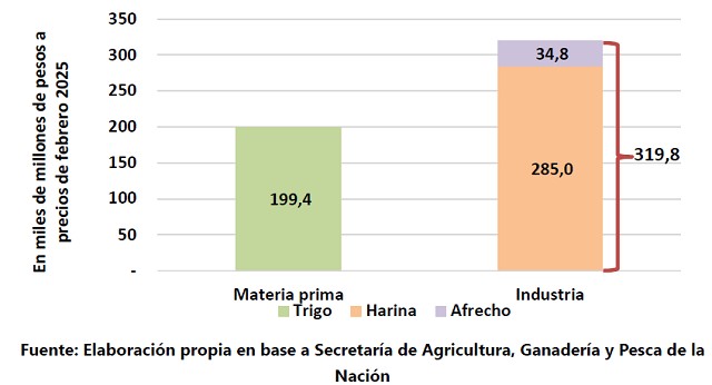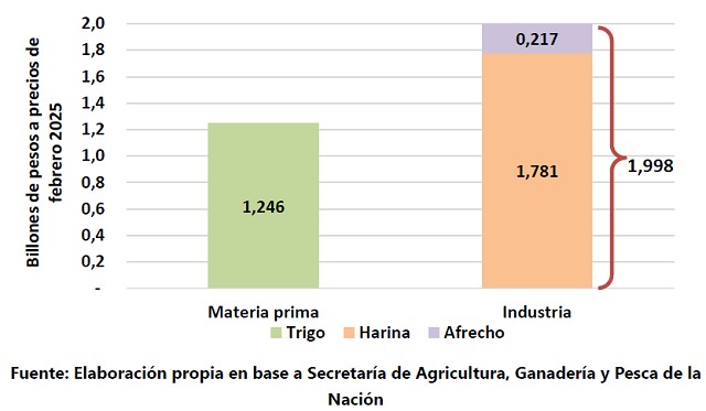 Según los precios vigentes en la primera semana de febrero de 2025, la molienda del año representa compras de trigo por 1,246 billones de pesos, a partir de la cual se genera una producción de harina valuada en alrededor de 1,781 billones de pesos y de afrecho 217,1 mil millones de pesos.