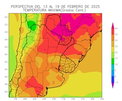 La perspectiva comenzará con temperaturas moderadas debido al ingreso de vientos del sur en los días precedentes, pero los vientos del Trópico retornarán con vigor, provocando amplios focos de calor extremo en el todo el norte y el extremo sudoeste del área agrícola, mientras el centro, el litoral atlántico y las zonas serranas del oeste observarán registros moderados. Paralelamente, se producirá el paso de un frente de tormenta, causando precipitaciones abundantes a muy abundantes, con posibles focos de tormentas, sobre el centro y el sudeste del NOA, el extremo sur de la Región del Chaco, el norte de la Región Pampeana, el centro de la Mesopotamia y el norte del Uruguay, mientras la mayor parte del resto del área agrícola recibirá aportes escasos a nulos, con focos de valores moderados. Junto con el frente, arribarán los vientos polares, causando temperaturas mínimas bajo lo normal en la mayor parte del área agrícola, a excepción de su porción centro-norte que continuará bajo el dominio de los vientos del trópico.