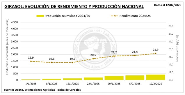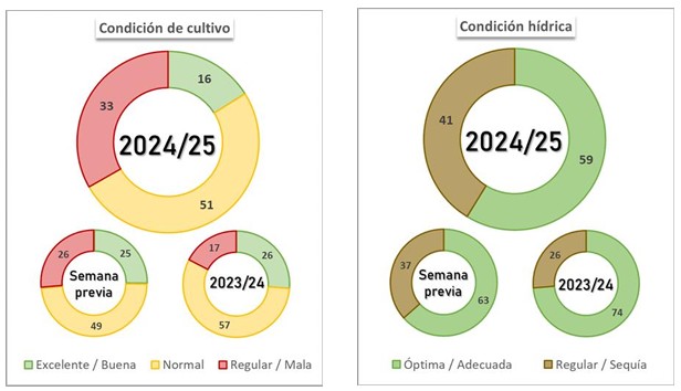 En el caso de girasol, la cosecha marcó un progreso intersemanal de 1,1 p.p., cubriendo el 9,5 % del área apta. Este avance refleja una demora de -3,5 y -12,8 p.p. respecto al ciclo previo y el promedio del último quinquenio, respectivamente. Esto se debe a una mayor proporción de la oleaginosa implantada en las regiones del sur del área agrícola, donde más de un 60 % de la superficie aún transita entre floración y llenado, afortunadamente bajo una condición de cultivo Normal/Excelente en más del 90% de los lotes. De mediar condiciones favorables, los rendimientos regionales podrían continuar marcando tendencia positiva sobre el rinde promedio nacional que actualmente se ubica en 21,9 qq/Ha.