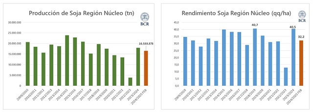 La sequía se sentirá con fuerza en la cosecha 2024/25. La primera proyección es de 16,5 millones de toneladas, muy lejos del horizonte productivo que se tenía a la siembra con un clima normal y que permitía anticipar 19,2 Mt. Aunque se sembró un 16% más, consecuencia de que las lluvias llegaron tarde se podría obtener 1,5 Mt menos respecto al año pasado. La falta de lluvias en enero marcó un quiebre en las expectativas y dejó pérdidas irreversibles. Aunque las lluvias de febrero frenan el deterioro, se estima un rinde menor, de 32,2 qq/ha, 8 quintales menos que en la campaña pasada. Con 5,3 M ha sembradas y 151.000 ha que no se cosecharían, la producción de 16,5 Mt ubica a esta campaña en el puesto 11° del ranking de los últimos 15 años, muy por debajo del récord de la 2014/15.