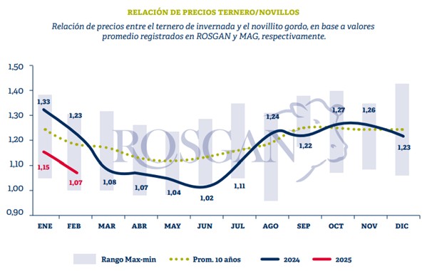 Esta misma relación, que hoy -en lo que va del mes- se ubica muy cercana a 1, históricamente, para esta época del año, cuando la oferta de terneros aún es escasa, oscila entre 1,15 y 1,20 kilos de ternero por kilo de novillito terminado.