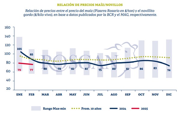 Sin embargo, tras la reciente suba del gordo, el valor del producto terminado acumula en igual período una variación del 16% en términos corrientes, pasando de promedios de $2.500 el kilo en diciembre a los $2.900 actuales. En definitiva, la relación insumo-producto arroja actualmente unos 77 kilos de gordo por tonelada de maíz, relación que, si bien es ligeramente más cara que lo que valía a fines del año pasado, es un 10% más barata que un año atrás y 12% inferior al promedio resultante para esta misma época en los últimos 10 años.