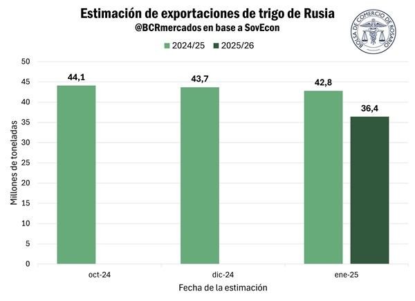 Semanas atrás, SovEcon volvió a recortar las estimaciones de exportación para la actual campaña del trigo ruso, que finaliza en mayo próximo. El volumen proyectado es de 42,8 Mt, 900.000 toneladas menos que lo publicado en diciembre y 1,3 Mt por debajo de las 44,1 Mt estimadas anteriormente. Este ajuste se realiza luego de que el gobierno ruso aplique una cuota de exportación de 10,6 Mt entre febrero y junio, solo poco más de un tercio de la del año pasado y la más baja desde el año 2020. Aunque la cuota fue considerada en línea con las estimaciones, que ya venían siendo reducidas por el bajo ritmo de embarques y la caída de los márgenes de exportación.