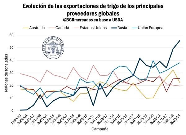 Este aumento productivo, en conjunto con las inversiones en infraestructura portuaria motivada por la decisión del gobierno de consolidarse como exportador de cereales, llevó a Rusia a posicionarse como mayor exportador de trigo del mundo por primera vez en la campaña 2017/18, al superar a Estados Unidos y la Unión Europea. Tras cierta inestabilidad, fue a partir de la 2020/21 que se consolidó como líder indiscutido en el mercado internacional de trigo.