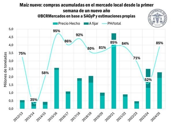 Esto último ha venido traccionando fuertemente los compromisos de maíz nuevo que se encontraban históricamente atrasados. Así, entre la cercanía del arranque de la cosecha y condiciones más atractivas, desde que comenzó el 2025 se cerraron contratos de maíz por un total de 2,3 Mt, de las cuáles 1,9 Mt se hicieron con precio en firme, el mayor volumen en cuatro años. Yendo más allá, el 85% de las toneladas de este año se hicieron con precio en firme, proporción que no veíamos desde la 2020/21, graficando lo atractivo de las condiciones comerciales actuales.