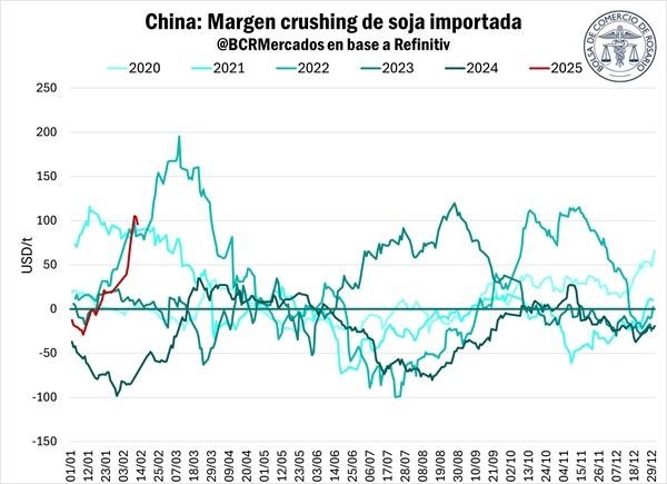 Poniéndolo en cifras, más de la mitad de las 2,5 Mt que se habrían enviado a China desde Estados Unidos y Brasil en 2025 irían a parar hacia las reservas estatales, quedando fuera del circuito comercial. Esto llevó a que los contratos de futuros de harina de soja en el mercado chino de Dalian escalaran un 18% desde enero. Situación que potenció muy fuertemente los márgenes de la industria china dada la alta demanda interna de harinas vegetales.