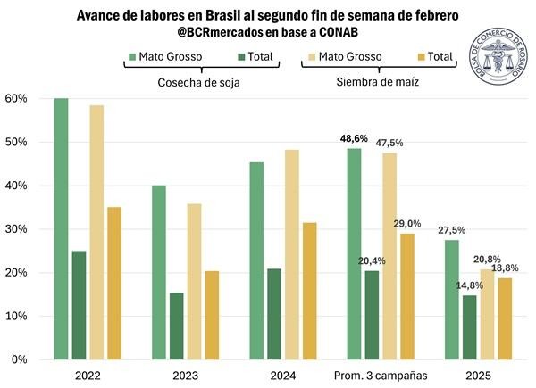 Al 9 de febrero, la cosecha de soja cubrió el 14,8% de la superficie cultivada, este avance se ubica casi 6 p.p. por detrás del promedio de las últimas 3 campañas a la misma fecha. La situación más compleja continúa en Mato Grosso, donde el rezago respecto de las últimas campañas es de poco más de 21 p.p. Esto complica a la safrinha, ya que este es el estado de mayor relevancia para esa cosecha.