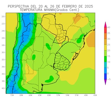 • El este del NOA, el centro y el norte de Cuyo, la mayor parte de la Región del Chaco, gran parte de la Mesopotamia, la mayor parte de la Región Pampeana y el Uruguay observarán temperaturas mínimas entre 15 y 20°C, con focos aislados de registros menores.