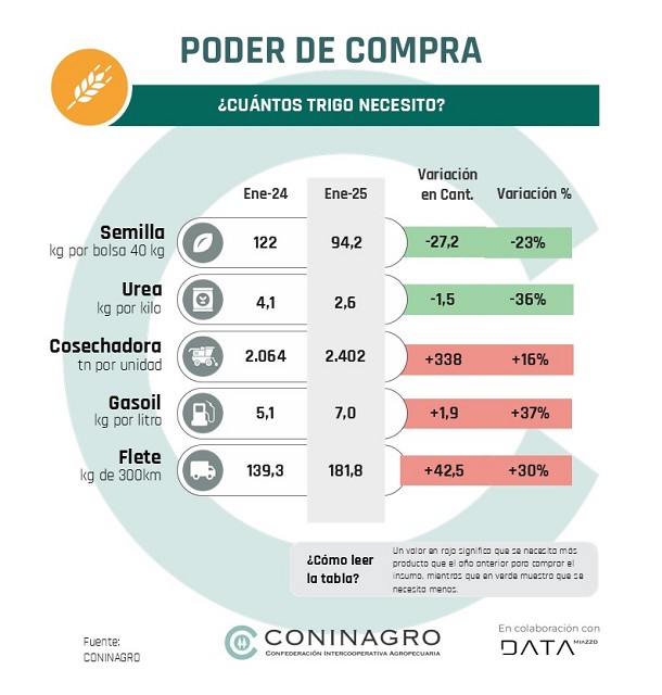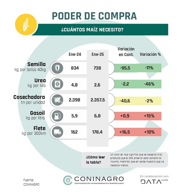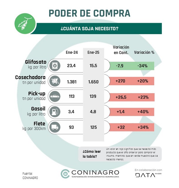 En gran parte, el encarecimiento de los fletes está relacionado al gasoil, insumo frente al que los granos también perdieron poder de compra. En enero de 2025 se necesitaron 40% más de kilos de soja para pagar un litro de gasoil que en enero de 2024.