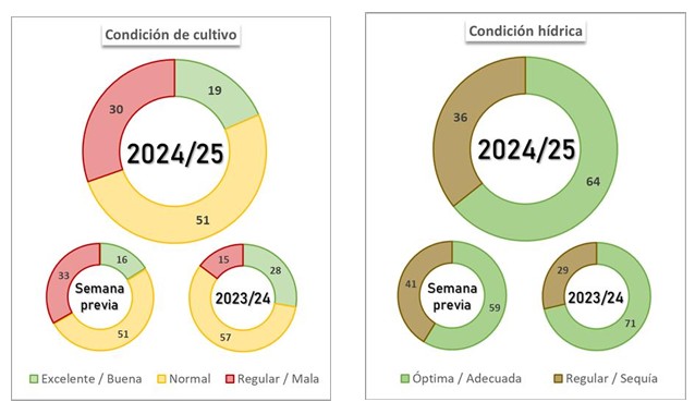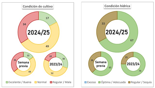 Se registro un aumento de 1,2 p.p. en la condición de cultivo Normal/Excelente, producto de las lluvias precedentes. El 67 % de lo implantado presenta una condición hídrica Adecuada/Óptima, 4,8 p.p. mayor al previo informe.