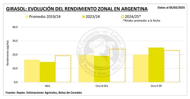 Por último, el progreso de las labores de cosecha de girasol fue de 1,3 p.p., alcanzando al 10,8 % del área apta. El rinde promedio nacional se ubica en 22 qq/Ha, manteniendo la actual proyección de producción en 4,1 MTn. La región del NEA se encuentra próxima a finalizar la recolección, con un rinde promedio que se ubica dentro de los primeros 5 mejores de la serie PAS. Así mismo, en el resto de las zonas del centro del área agrícola, los rendimientos relevados hasta el momento, también se ubican por encima del promedio histórico, e incluso cercanos a los máximos. Sin embargo, el 38,4 % del área en pie se encuentra transitando el llenado de grano, del cual el 89 % se concentra en las provincias de Buenos Aires y La Pampa, donde el 72,2 % presenta condición hídrica Regular/Seca. Por lo tanto, la productividad en estas zonas se encuentra ligada a la ocurrencia de las lluvias pronosticadas para la próxima semana.