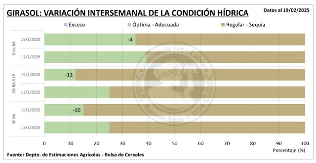 En lo que respecta a maíz, la cosecha se ha concentrado en las provincias de Santa Fe y Entre Ríos, con avances incipientes en Buenos Aires. Las lluvias mencionadas han tenido un impacto positivo en los planteos tardíos, los cuales se encuentran en período crítico (VT-R1) en un 70,5 % de los casos relevados. Como resultado, la proporción de lotes en condición entre Normal y Excelente ha mostrado una mejora estimada en 2,1 p.p., deteniendo el deterioro observado en enero y lo que va de febrero. Por otro lado, los planteos de fecha intermedia, sembrados entre mediados de octubre y principios de noviembre, han sido los más afectados por el déficit hídrico y las temperaturas elevadas durante la floración. En estos casos, las precipitaciones recientes no han generado una mejora significativa en su estado, ya que la etapa fenológica clave transcurrió bajo condiciones adversas. Finalmente, en la porción sur del área agrícola, no se han registrado eventos de precipitación generalizados. En este contexto, la evolución del cultivo en esta región dependerá críticamente de los pronósticos climáticos a corto plazo, ya que la disponibilidad de agua será determinante para un adecuado cuaje de los granos.