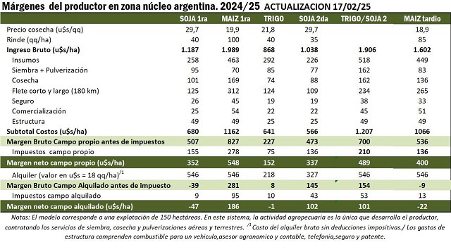 Al 17 de febrero de 2025, el maíz de primera lidera los márgenes netos en campo propio, alcanzando 548 u$s/ha con un rinde de 100 qq/ha. Le sigue el doble cultivo trigo/soja 2da con una rentabilidad neta de 489 u$s/ha en campo propio, considerando un rinde de trigo de 40 qq/ha y 35 qq/ha para la soja.