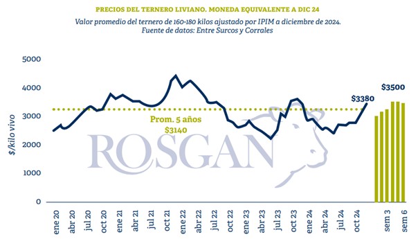 En términos relativos, el valor del ternero liviano de 160 a 180 kilos -el que usualmente se toma como referencia para el seguimiento de la zafra- se encuentra en muy buenos niveles. Comparado con el promedio de los últimos 5 años ($3.140 a valores de diciembre de 2024), hoy un ternero por el que se obtiene -en promedio- unos $3.500 el kilo ofrece un valor 10% superior.