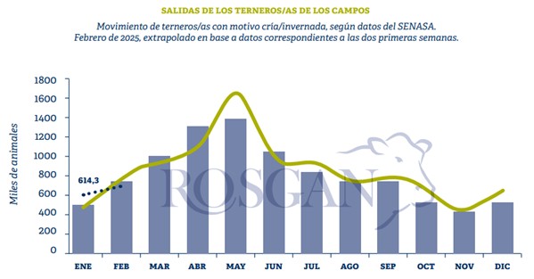 En enero, los datos del SENASA mostraban un movimiento de hacienda récord para ese mes, con cerca de 615.000 terneros y terneras saliendo de los campos de cría con destino a otros establecimientos de cría y/o invernada. Esto representaba un aumento del 21% en relación al nivel de traslados registrados en enero de 2024 y el nivel más elevado desde que el organismo publica estos mismos registros, año 2017.