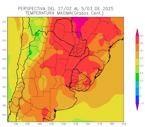 El este del NOA, el este de Cuyo, la mayor parte de la Región Pampeana y el centro y el sudeste del Uruguay observarán temperaturas máximas superiores a 30°C, con un amplio foco con temperaturas superiores a 35°C, que abarcará el Paraguay, gran parte de la Región del Chaco, el este de Salta, la Mesopotamia, el norte de Córdoba, el nordeste de la Región Pampeana y el oeste y nordeste del Uruguay y otros focos con valores inferiores.