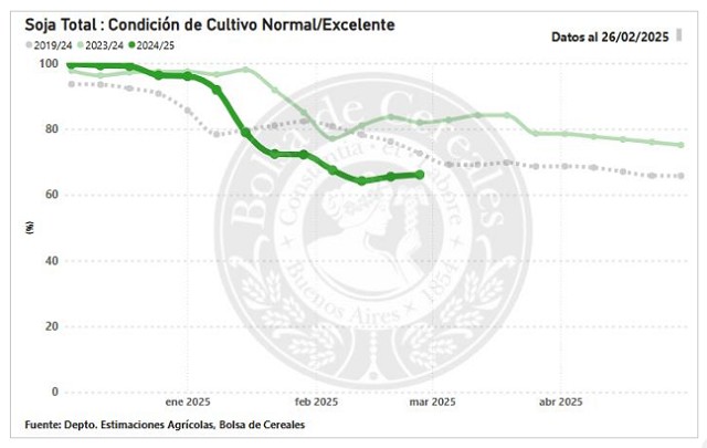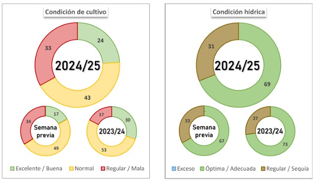 El 67 % de la soja, a nivel nacional, presenta una condición de cultivo Normal/Excelente, mientras que el 69 % sostiene una condición hídrica Adecuada/Óptima. El 22,6 % de lo implantado ha iniciado el llenado de grano.