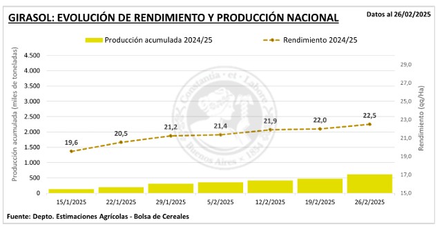 Por su parte, luego de un progreso intersemanal de 3 p.p., la cosecha de girasol alcanza el 13,8 % del área apta. Las lluvias de las últimas semanas han demorado el secado de los granos, resultando en un retraso de -4,7 p.p. respecto al ciclo previo y de -15,3 p.p. en comparación con el promedio de las últimas cinco campañas. Actualmente, un 27 % del área se encuentra en la etapa de llenado de grano, concentrándose principalmente en el sur del área agrícola, donde las expectativas de rendimiento superan los promedios históricos. En esta región, las lluvias pronosticadas para los próximos días podrían agravar los problemas ocasionados por las precipitaciones recientes, que ya han generado casos puntuales de vuelco de plantas. Aunque los productores destacan la buena sanidad del cultivo, la persistencia de condiciones húmedas eleva el riesgo de enfermedades y nuevas pérdidas de stand.