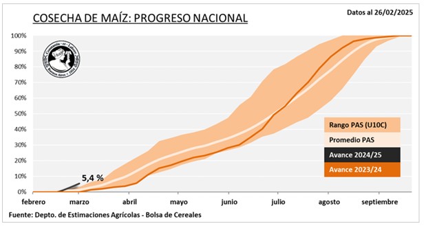 La cosecha de maíz con destino a grano comercial avanzó 3 p.p. en la última semana, alcanzando un progreso del 5,4 % del área estimada para la campaña, que se sitúa en 6,6 MHa. Este avance es 3,7 p.p. superior al promedio de las campañas 2019/24. Los mayores progresos se registraron en el Centro-Norte de Santa Fe, Entre Ríos y la zona núcleo. En esta última, las labores se adelantaron debido al estrés termo-hídrico sufrido por los cultivos durante el llenado de granos, lo que, en algunos casos, provocó una finalización anticipada de esta etapa, resultando en pérdidas de rendimiento por menor peso de los granos. A pesar de estas condiciones, los resultados preliminares indican un rinde medio de 77,9 qq/Ha, con una producción parcial de 2,77 millones de toneladas. En este contexto, mantenemos nuestra proyección de producción en 49 millones de toneladas, lo que representa una reducción de 0,5 millones de toneladas en comparación con la campaña anterior.