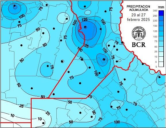 Grandes lluvias semanales, pero con una dispersión marcada: los registros van de 234 a 4 mm. En promedio, la red de estaciones GEA/BCR recibió 77 mm. Hubo tres grandes focos de lluvias, dos en el centro del sur de Santa Fe: Montes de Oca con la gran marca de 234 mm y Bigand con 158 mm. Y el tercer núcleo, en Colonia Almada, en el centro cordobés con 163 mm acumulados.