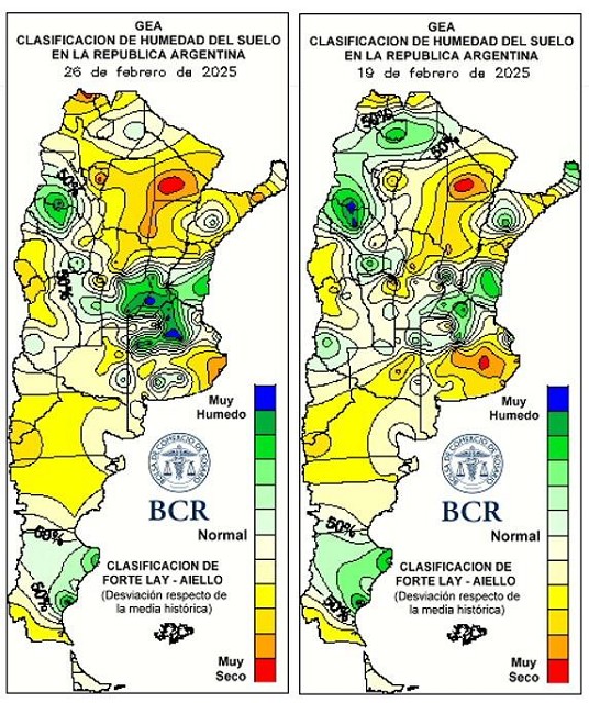 Para la soja de segunda llega con más tiempo, aunque por otro lado, sufrió más la escasez durante el crecimiento, generando plantas de muy bajo porte. Los técnicos coinciden en señalar que más allá de la fuerte pérdida de plantas en grandes áreas, la recomposición del cultivo es evidente: “la soja de segunda es la que más ventaja ha sacado de estas precipitaciones”. En los últimos 15 días, los lotes en condiciones regulares a malas disminuyeron en 20 puntos porcentuales, abarcando ahora el 60% del área. El 30% se encuentra en buen estado y el 10% en condición muy buena. Actualmente, la mayor parte de los lotes se encuentra en plena formación de chauchas y los más adelantados ya han iniciado la formación de semillas. En la zona de Marcos Juárez destacan que "el cultivo aún tiene margen para mejorar su producción".