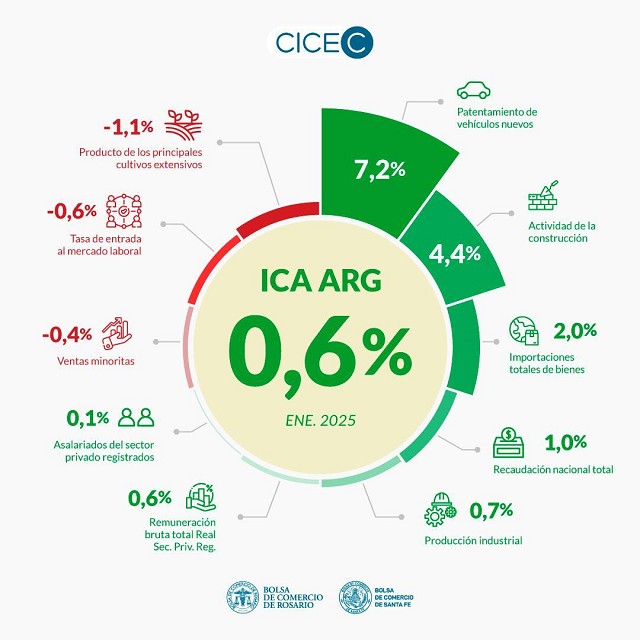 El Índice Compuesto Coincidente de Actividad Económica de Argentina (ICA-ARG), elaborado por las Bolsas de Comercio de Rosario y Santa Fe en el marco del Centro de Investigación del Ciclo Económico (CICEc), registró en enero de 2025 una variación mensual de +0,6%, manteniendo la senda positiva de los últimos diez meses. En términos interanuales, el índice mostró un crecimiento del +4,3%, lo que confirma la consolidación del proceso de recuperación iniciado en abril de 2024.