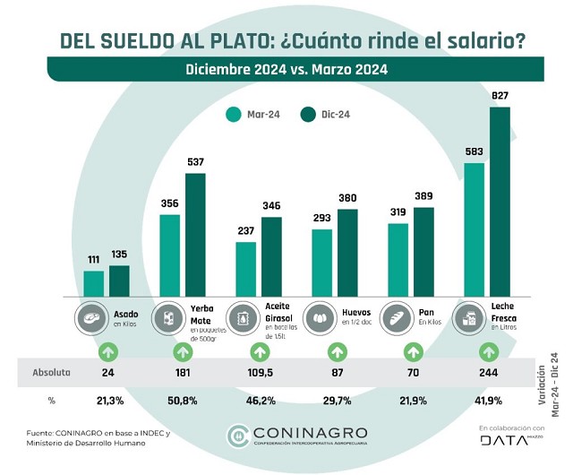 Entre marzo y diciembre de 2024, el salario (medido por RIPTE) ganó poder de compra respecto a los seis alimentos básicos que monitorea CONINAGRO en este informe: aceite de girasol, yerba mate, leche, asado, huevo y pan.