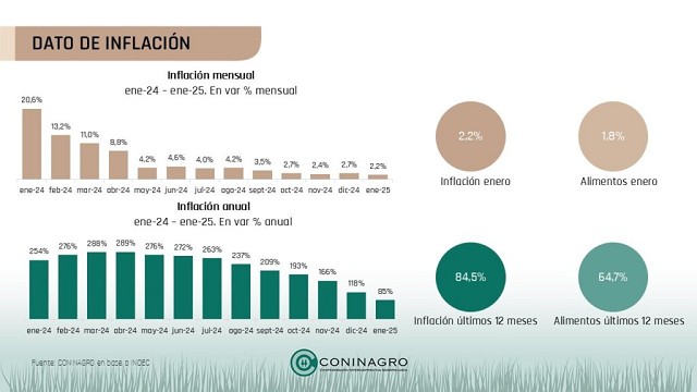 Si bien los datos de salarios sólo llegan hasta diciembre, el INDEC ya informó inflación mensual de enero, que fue del 2,2%, el nivel más bajo desde julio de 2020. La variación interanual se sitúa en el 84,5%.