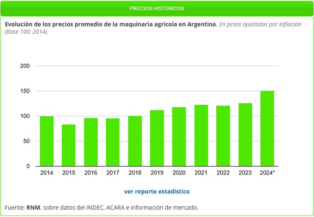 Según el último reporte estadístico de Precios Históricos del RNM (Radar de Negocios Maquinac), elaborado en base a datos oficiales del INDEC, entre enero y septiembre de 2024 los precios promedio de la maquinaria se ubicaron 40,6% por encima de la media de los últimos 10 años, medida en moneda contante, es decir, ajustada por inflación.