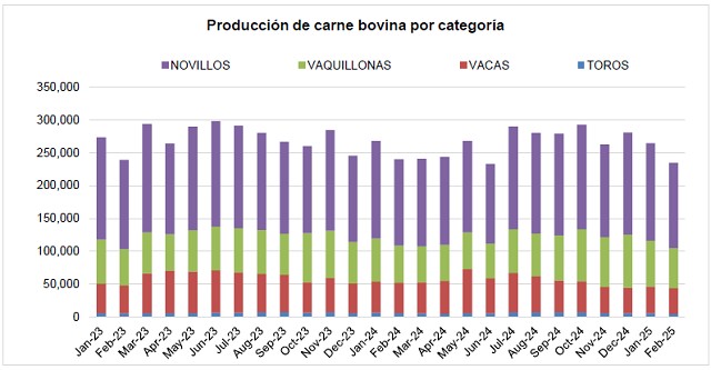 La producción de carne bovina del mes de febrero de 2025 alcanzó las 234,6 mil toneladas res con hueso, recortándose en 30,0 mil toneladas con respecto al mes anterior, y también retrocediendo en 5,3 mil toneladas con respecto al mes de febrero del año 2024. En los primeros dos meses del año 2024, la producción de carne bovina alcanzó las 499,2 mil toneladas equivalente res con hueso; situándose 8,5 mil toneladas por debajo del acumulado del período enero a febrero de 2024, que había ascendido a 507,7 mil toneladas equivalente res con hueso.