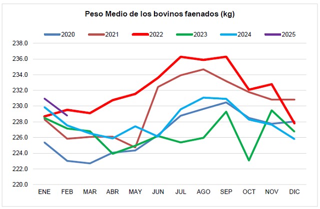 El peso promedio de las carcasas bovinas correspondiente al segundo mes del corriente año alcanzó los 228,8 kilogramos, siendo un (-0,9%) inferior a los 231,0 kilogramos del último mes de enero; y resultando levemente superior, (+0,5%), a los 227,5 kilos de febrero de 2024. El peso medio de las carcasas durante los dos meses que han transcurrido del corriente año se ubicó en 229,9 kilogramos; un (+0,5%) por encima de los 228,8 kilogramos del mismo periodo del año anterior.