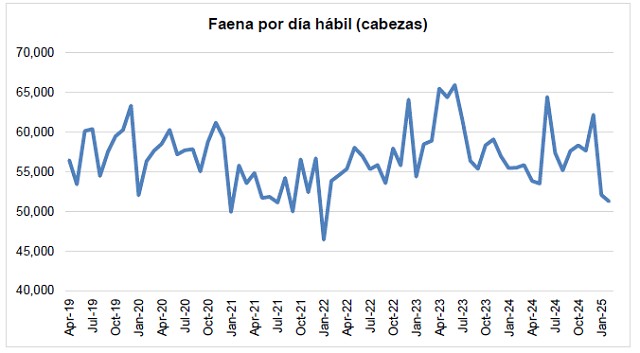 La faena diaria del mes de febrero del corriente año, se ubicó en 51,3 mil cabezas, un (-1,5%) por debajo de las 52,1 mil diarias procesadas en enero, y un (-7,6%) por debajo de las 55,5 mil correspondientes a febrero de 2024.