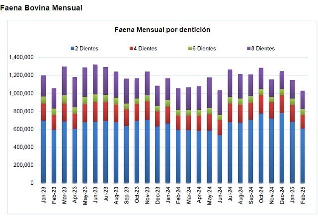 En los primeros dos meses del año 2025, se faenaron 2,17 millones de bovinos; un (-2,2%) menos que los 2,22 millones que se habían faenado entre enero y febrero de 2024. Las mayores diferencias interanuales en la faena provienen de las vacas de ocho o más dientes, que recortaron en 58,8 mil cabezas la faena acumulada en los primeros dos meses del año pasado, los machos de cuatro dientes, que disminuyó su matanza en 18,0 mil cabezas, y las hembras de seis dientes, que mostraron una caída interanual de la faena de más de 13,7 mil cabezas; y, en sentido contrario, por las hembras de dos dientes, cuya faena superó en cerca de 45,4 mil cabezas a la registrada entre enero y febrero del año 2024.